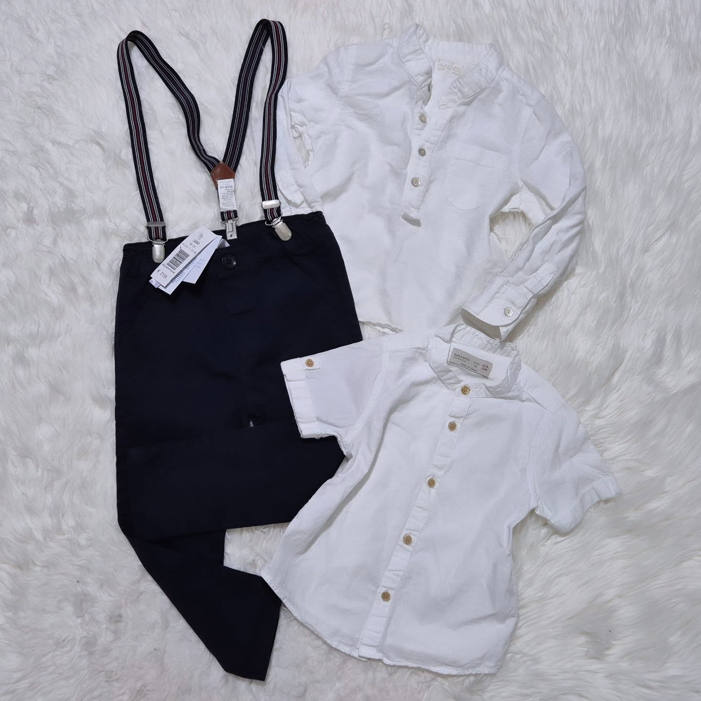 3-delni komplet št. 98: Idexe nerabljene hlače z trogarji z etiketo, prodajna je znašala 21.95€ + Zara srajca kratek rokav št. 104 – primerna za 98, lunilou 100% lanena srajca – ima eno 2mm komaj opazno rjasto pikico (kar je hitro pri lanu) na koncu srajčke, nič kar bi oviralo nošenje ali izgled.