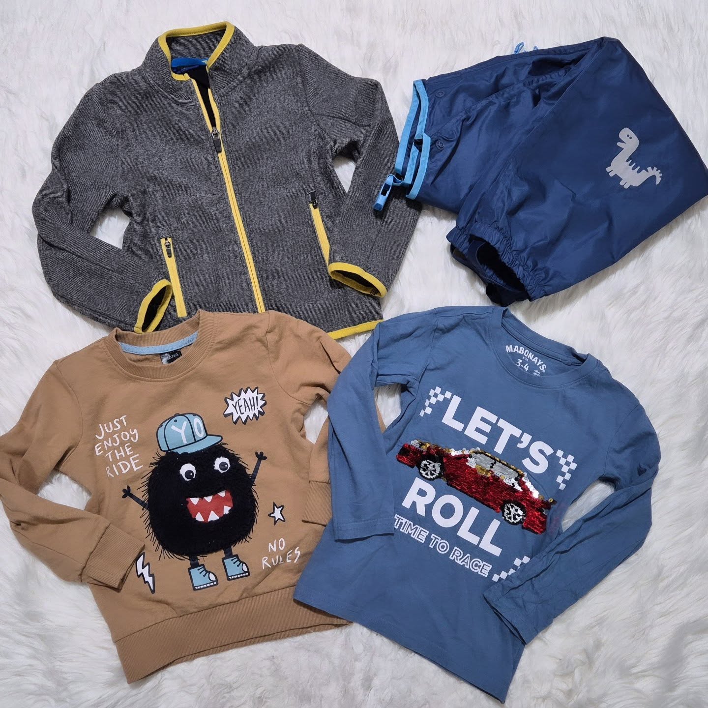 4-delni komplet št. 98/104: 2*Mana, lupilu jakna-“jopica”, dežne hlače. Vse je odlično ohranjeno.