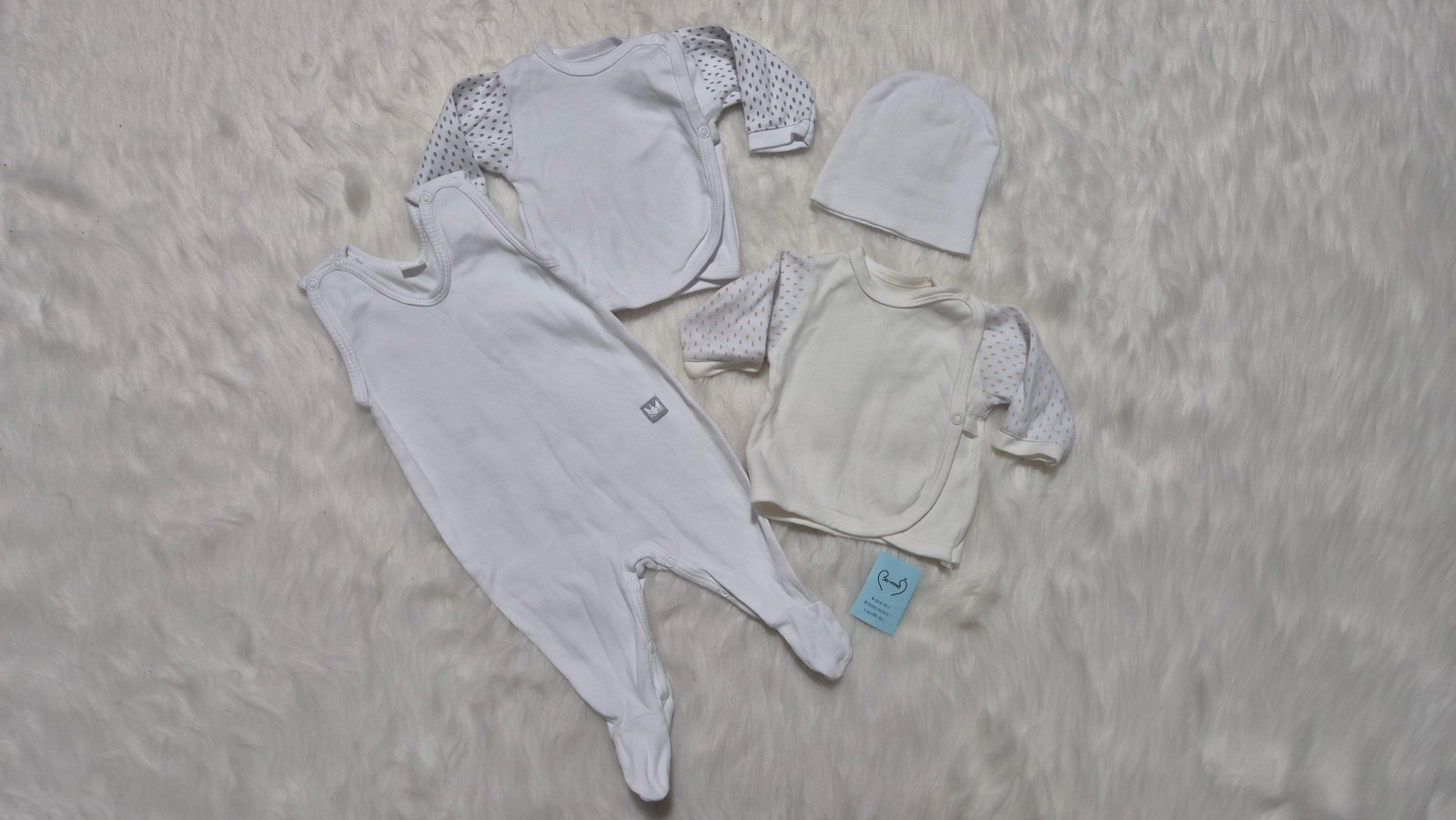 4-delni komplet univerzalnih oblačil št. 62: 2* benkica, 1* bombažna kapa, 1* bombažen pajacek. Odlično ohranjeno, večina le oprano. Pinokio in drugo.