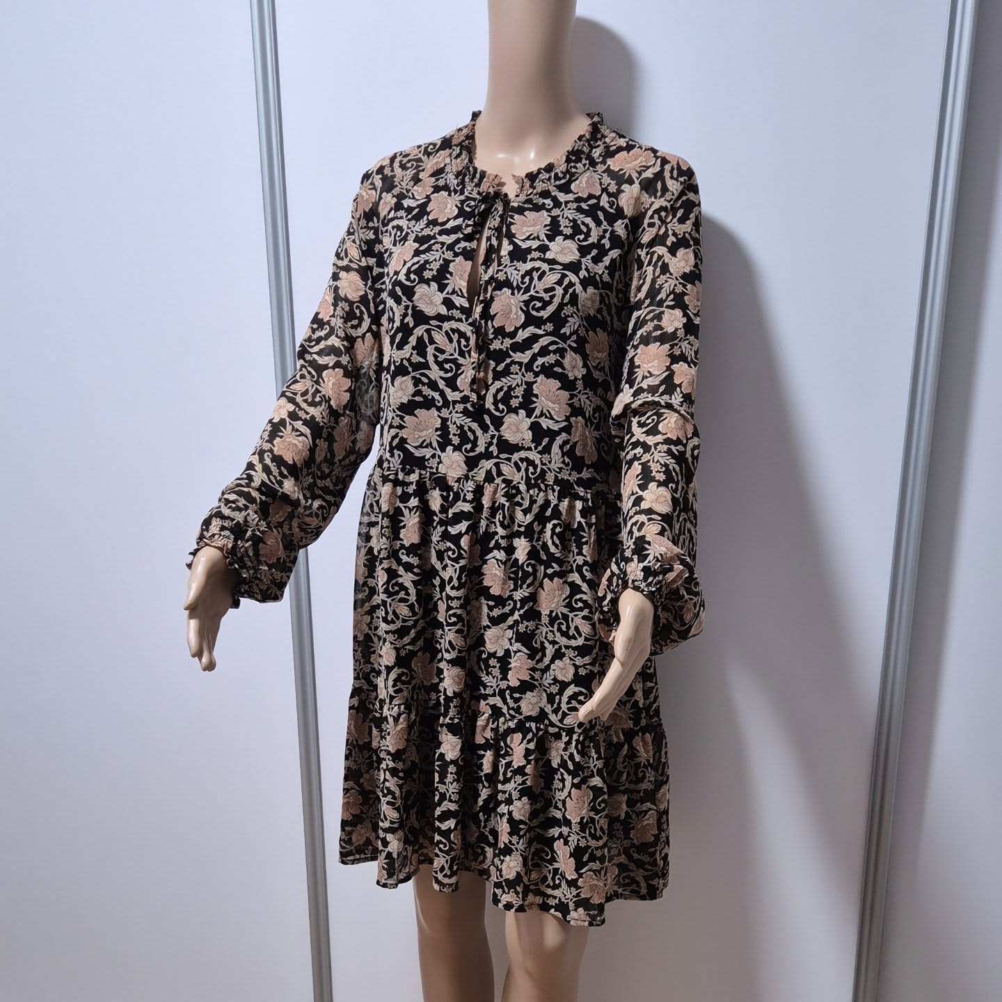 Amisu cvetlična obleka št. 42. Rokavi rahlo prosojni, preko trupa ima podlogo, pri izrezu se zavezuje. Le oprana.