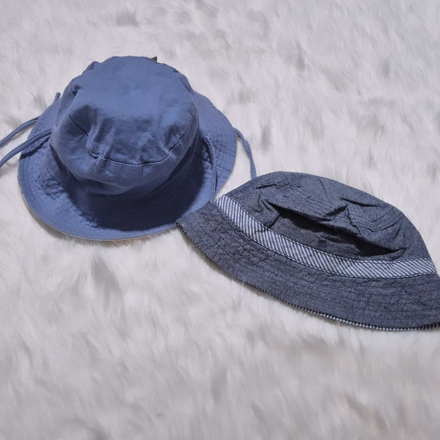 H&M + Obaibi poletni klobuk št. 12-18mths (cca.49cm). Oba sta 2-stranska, H&Mov se zavezuje, Obaibi se ne. Oba zelo lepo ohranjena, edino H&Mov ima na drugi strani (potisk dinozavrov – svetla barva, kakšen madež) tako da je nosljiv na modri strani, le ta je brezhibna brez zankov uporabe.