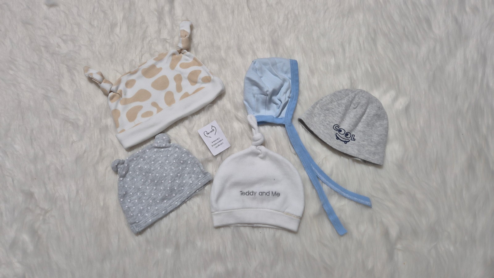 Komplet: 5* kapica 0-6mths: CLAR, COOL CLUB, enobaby, Topomini, Lucky kiddo: 1* pliš, 1* za po kopanju, 3* prehodna. Odlično ohranjene.