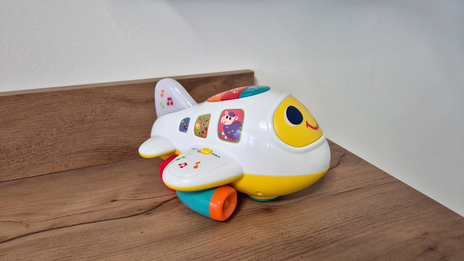 Sestavljeno iz privlačnih klasičnih barv ter igralnih in svetlečih elementov. 12m+. Ima gumbe, ki bodo odkrivali različne vrste zvokov, premična kolesa, svetlobni in zvočni efekti bodo poskrbeli, da bo zabava postala prava zabava. Otrok se lahko igra z igračo, tako da ji sledi, se poskuša plaziti ali naredi prve korake, kot tudi tako, da letalo potiska naprej. Letalo ima dva načina igre, v prvem načinu bomo slišali črke in številke, izgovorjene v angleščini, v drugem pa bomo letalo pognali in slišali vesele melodije. Izdelana je iz plastike, ki jo odlikuje visoka zanesljivost in vzdržljivost. Ta material je certificiran, zaradi česar je igrača zelo udobna in varna za uporabo. Otroško igračo napajajo tri 1,5V AA baterije, ki niso priložene v kompletu. ODLIČNO ohranjeno.