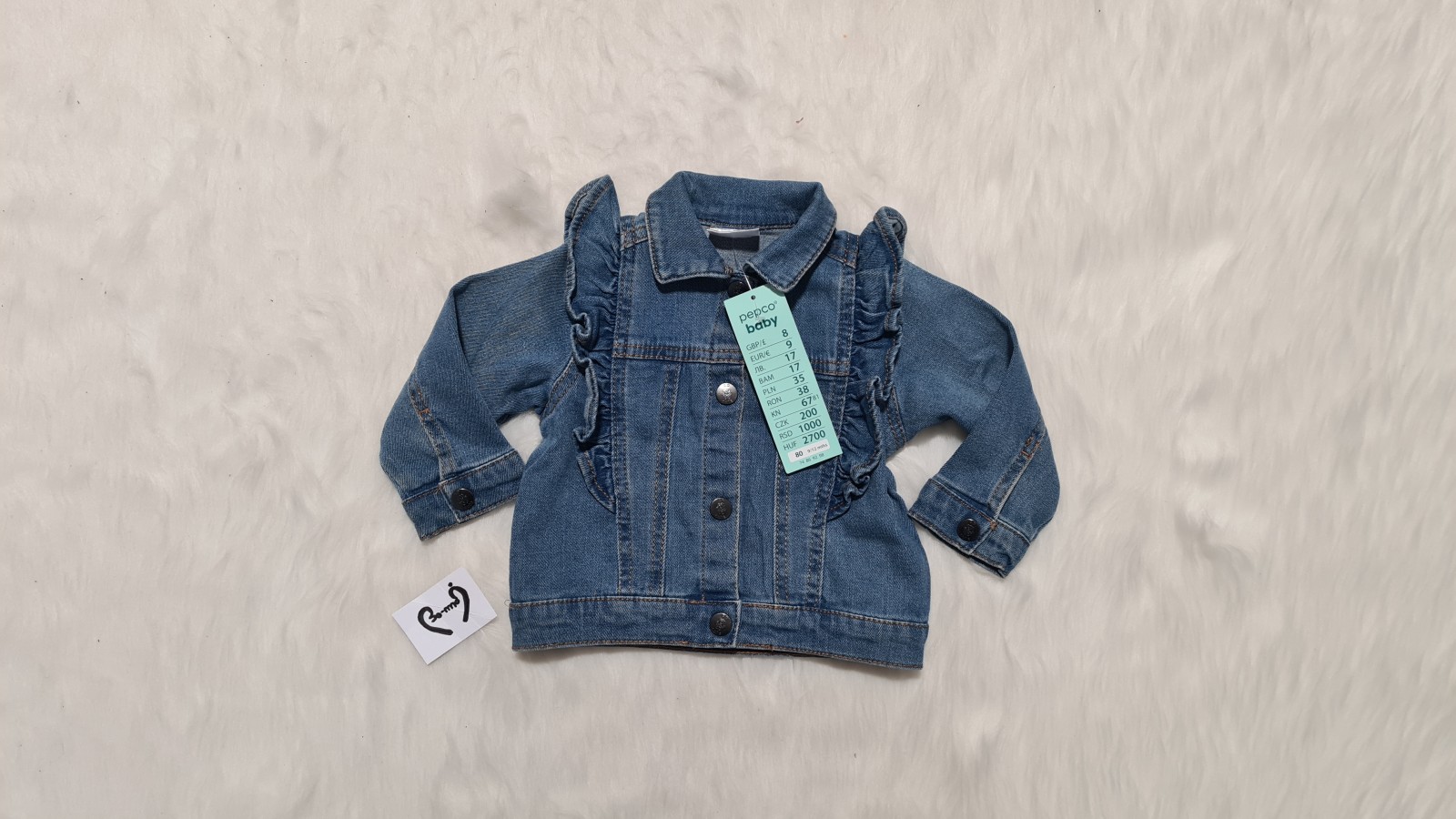 Pepco elastična jeans jakna št. 80. Mehka in elastična, zapenja se na gumbke na klik, z volančki. Nerabljena z etiketo, prodajna cena je znašala 9€.