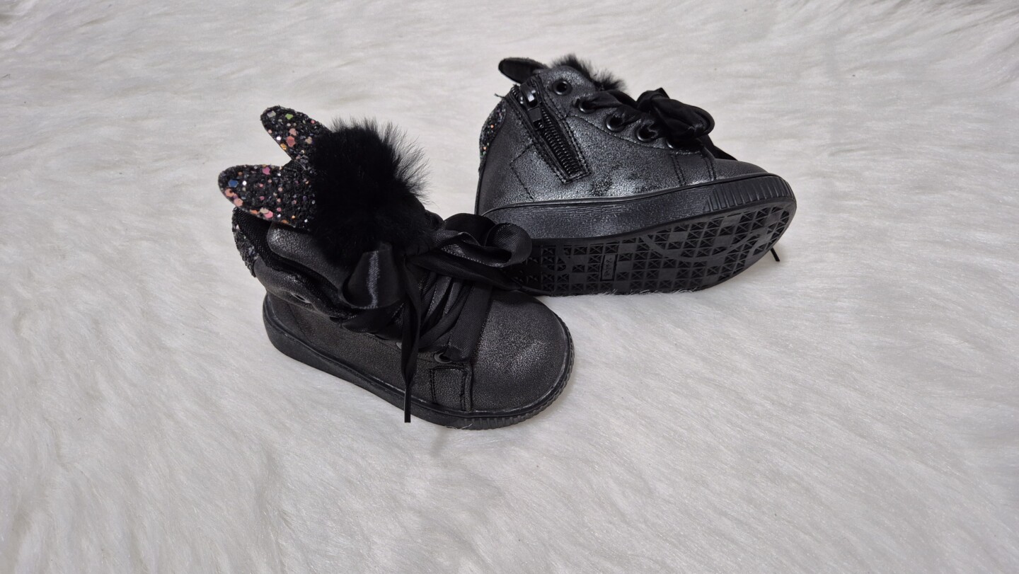 Višji črno-srebrni čevlji: zajčki (bleščeča ušeska) št. 19. Imajo srebrn “pridih”. Notranja dolžina vložka: 12.3cm. Nerabljeni. Ob strani zadrga za lažje obuvanje.